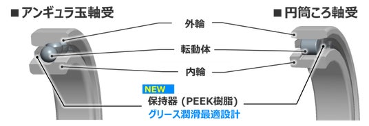 アンギュラ玉軸受では、世界初のグリース潤滑でdmn値※180万を達成(自社調べ)。軸受の昇温は従来品比約30%低減し、グリース寿命は約20%向上しました。