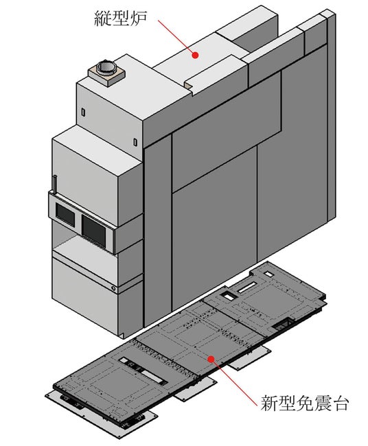 「縦型炉用新型免震台」は、中小地震(およそ震度3~5弱)では縦型炉内にあるウェハーの欠陥の低減、大地震(およそ震度5強以上)では縦型炉本体と石英パーツを保全することで、幅広い地震動に対応が可能な免震台です。