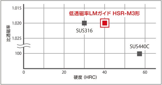 構成部品に低透磁率材料を使用することで比透磁率1.02を達成し、磁場環境下でも製品性能を発揮します。また、40HRC以上の硬度を有しているため、低透磁率材料として知られているSUS316 と比べ大きな荷重を受けることが可能です。