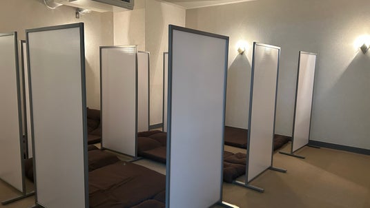 新たに設置する寝ころびマットレスは、従来よりも幅を約20cm広げた100cmサイズとし、よりゆったりとご利用いただけます。さらに、横と正面に衝立を設置し、周囲の視線を感じにくい環境を実現しました。常時、部屋の明かりを落としており、静かにくつろいでいただける空間づくりに配慮しています。
