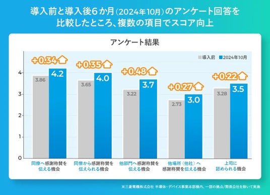 導入前と導入後でアンケートを実施したところ、「称賛」「承認」に関するスコアが向上。日々のコミュニケーションの変化に対しても下記のようなお声を頂戴しております。