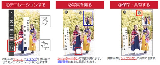 クリスマスイベントで開発したARフォトフレームをさらにバージョンアップし、スタンプの拡大縮小回転等、様々な機能を追加しました。京都産業大学では、毎年卒業式の当日、メインホール前の卒業式の立て看板前に行列待ちができるため、晴れの日にキャンパス内の思い出の場所・好きな場所で自由に撮影できるように、立て看板風のARフォトフレームや、大学ロゴと卒業式の年月日入りの限定スタンプなどを制作いたしました。