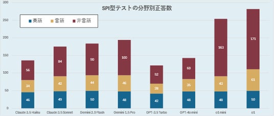 今回の比較により、これまで生成AIが不得意だった文章整序(言語)、特殊計算(非言語)の正答率がOpenAI o1で初めて80%に達しました。正答数では、OpenAIのo1-previewが295問中282問正解(正答率95.6%)で、2位のアンソロピックのClaude 3.5 Sonnetの175問正解(同59.3%)に大差をつけました。