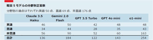 軽量モデルの比較でも、o1-miniの性能が際立ちます。正答数は254点(同86.1%)で、従来のどの標準モデルよりも高性能でした。なお、グーグルが12月11日に発表した最新のGemini 2.0 Flashの正答数は184点(同62.4%)で、Gemini 1.5 Proの194点(同65.8%)に匹敵するほど向上しました。