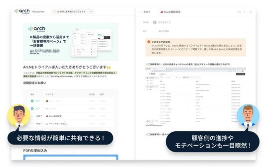 「Arch by HiCustomer」とは『売り手と買い手の成果をエフォートレスに』を製品ビジョンに掲げる、LTV最大化を目的とした顧客専用ページを簡単に作れるSaaSプロダクトです。作った顧客専用ページには製品資料や見積り、議事録など顧客が購買可否を検討する際に必要なデータを配置したり、導入検討や導入支援で活用する顧客との共同タスクの管理を行うことができます。