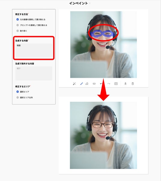 修正したい箇所を指定して、修正内容を指示することで、画像を理想に近づけることができます。