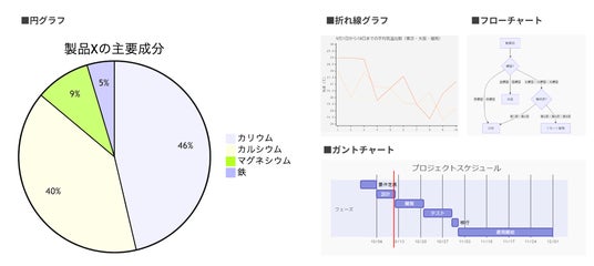 今回の新機能では、このMermaid記法の仕組みと生成AIの機能を組み合わせることにより、Mermaid記法を用いない自然言語での入力(指示)でも、グラフやフローチャートといった視覚コンテンツを生成できるようになりました。