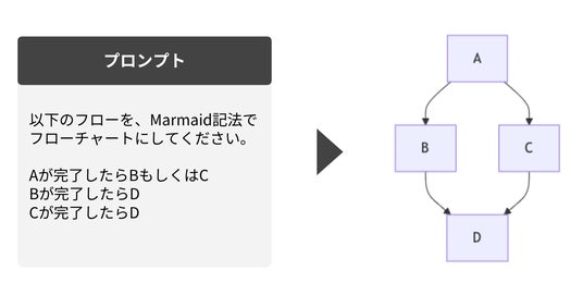 表現したい内容を自然言語で表現しつつ、Mermaid記法で視覚化するように指示することで、視覚コンテンツを生成することができます。