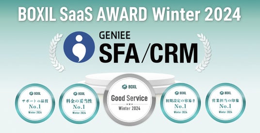 株式会社ジーニー(本社:東京都新宿区、代表取締役社長:工藤 智昭、以下ジーニー)が開発・提供する営業管理ツール「GENIEE SFA/CRM」が、スマートキャンプ株式会社(以下、スマートキャンプ)が開催する「BOXIL SaaS AWARD Winter 2024」のSFA(営業支援システム)部門で4期連続「Good Service」を受賞しました。また「サポートの品質No.1」「料金の妥当性No.1」「初期設定の容易さNo.1」など、これまでに受賞実績があるNo.1の称号に加え、今回新たに「営業担当の印象No.1」を受賞しました。