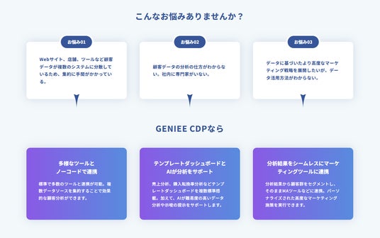 株式会社ジーニー(本社:東京都新宿区、代表取締役社長:工藤 智昭、以下ジーニー)は、「GENIEE Marketing Cloud」のサービスのうち、顧客体験(以下CX)向上の実現に関連する各プロダクトを紹介するWebサイトを新たに開設したことをお知らせします。