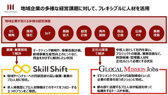 当社は、地方副業マッチングプラットフォーム『Skill Shift』(https://www.skill-shift.com/)と、地方転職マッチングプラットフォーム『Glocal Mission Jobs(GMJ)』(https://glocalmissionjobs.jp/)を運営し、地方中小企業が都市部の優秀な人材を経営幹部や後継者として、正社員採用、または副業採用をするための支援を行っています。