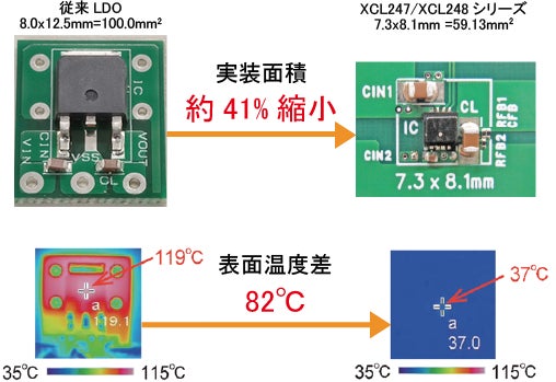 XCL247/XCL248の最大の特徴は36V高耐圧でありながら超省スペース(図1)、かつ自己消費電流が11μAと小さいため、VIN=12V, VOUT=5V, IOUT=1mAの効率は86%、IOUT=300mA時では88%と、軽負荷から重負荷まで高効率を実現する点です。(図2)この省スペースかつ高効率という特徴を活かし、従来から広く使われているパッケージサイズの大きい中高耐圧LDOからXCL247/XCL248に置き換えることで、ICの発熱課題を簡単に解決致します。(図3: 8.0x12.5mm ⇒ 7.3x8.1mmで40%サイズダウン、発熱対策の例)