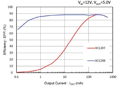 XCL247シリーズは常にリップル電圧が低く安定動作が可能なPWM固定制御、XCL248シリーズは軽負荷から重負荷まで常に高効率なPWM/PFM自動切替制御を採用しており、用途に合わせて最適な制御方式を選択できます。