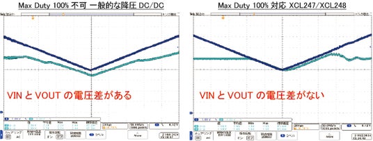 またXCL247/XCL248シリーズは中高耐圧DC/DCコンバータによく使用されるNchドライバFETではなく、PchドライバFETを採用、これにより100%デューティー対応が可能なため、入力電圧が出力電圧設定値よりも下がった場合でも、入力電圧をそのままスルーして出力することが可能です。これにより、入出力電圧差があまり無い条件でも安心してご使用頂けます。(図4)さらに、出力電圧が十分に立ち上がったことをお知らせするPowerGood機能と、起動時のソフトスタート機能を使用することで、産機で要求の多い後段負荷システムの電源シーケンス制御を行うことが可能です。