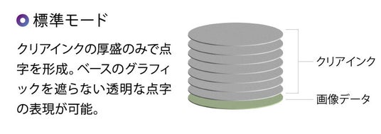 インクを自由に積層できるUVプリント方式では立体印刷によるグラフィックのテクスチャ(凹凸)表現が可能ですが、インクの積層に時間が掛かるため実用例が多くありませんでした。JFX200-1213 EXは当社独自のUVプリント技術によりその制作時間を大幅に短縮し、点字やピクトサインを使用した立体案内板を簡単に制作できます。また点字の用途に応じて「標準モード」と「高速モード」を搭載し、標準デザインソフトと標準添付のRIPソフトだけで実用可能。導入したその日からテクスチャデザインをカタチにできます。