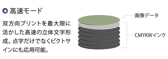 - 独自のUVプリント技術により立体印刷がさらに高速に。点字・ピクトサインを従来の約2倍*の速度で制作が可能。 *当社UJFシリーズ比