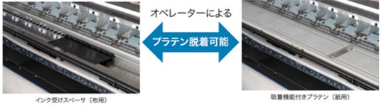 転写紙のプリントにおいては着脱可能なプラテン(プリント盤面)を搭載(図4)することでプリント部での転写紙のしわを低減させ、長尺プリントでもヘッドの擦れによる基材の無駄を削減します。