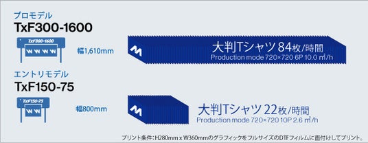 2023年4月に発売した当社初のDTFプリンタ「TxF150-75」は、色鮮やかなプリントとインクの吐出問題が少なく安定稼働であることからお客様より多大な評価をいただいております。一方で市場からはさらに生産性の高いプロモデルのDTFソリューションの要望を受けておりました。当社がこの度発表する「TxF300-1600」は、オリジナルプリントTシャツの生産性を従来機から最大約4倍にアップしました*(図1)。
