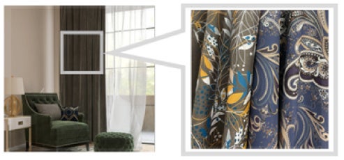 DTFプリント方式は、プリントシステム1台で綿、混紡やポリエステルなどの幅広い生地に、また濃色の生地への鮮明な加飾が可能です(図2)。さらに従来機からプリント幅を約2倍に拡張し、比較的広幅なインテリアファブリックのオリジナルプリントが可能になりました。特に濃色の生地の種類が多い市販のカーテンやフロアマットを簡単に加飾し色鮮やかなオリジナルインテリアを手軽に制作できます。(図3)。