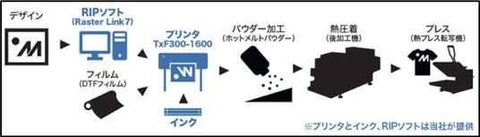 「TxF300-1600」は2024年10月の販売開始を予定しており、オリジナルウェア及びインテリアファブリックへのプリント用途に年間約150台の販売(全世界)を見込んでいます。なお、当社から提供するのはプリンタとインク、RIPソフトであり、DTFのプロセス(図4)で用いるフィルム、ホットメルトパウダー、パウダー塗布装置および後加工機、熱プレス転写機についてはプリンタ販売時、当社の推奨仕様をお客様に提示いたします。