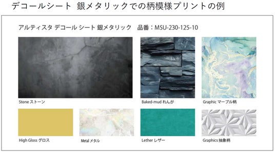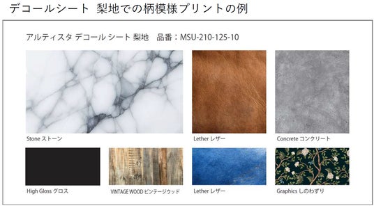 梨地、木目、及び銀メタリックの3種類の表面テクスチャのシートをラインナップしており、使用するシーンによって質感、風合いにもこだわった幅広い表現が可能です。大理石やコンクリートなど素材の柄模様のプリントや色数の多いグラフィックのプリントにも適しております。もちろん、プリントせずシート自身のテクスチャの状態でも活用頂けます。