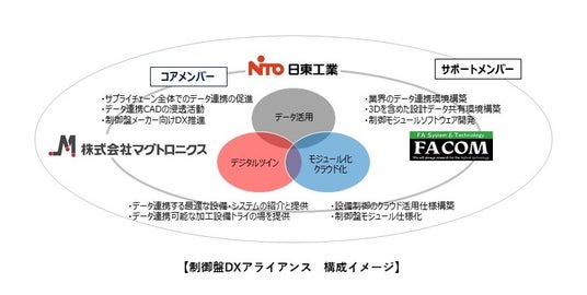 本アライアンスは、日東工業、マグトロニクス、新エフエイコムの3社がコアメンバーとして主導するほか、サポートメンバーとして、製造業関連のさまざまな企業が参画します。異なるスキルとノウハウを持つ企業が連携して、「データ活用」「デジタルツイン」「モジュール化」「クラウド化」などの要素を取り入れて制御盤DXを推進します。