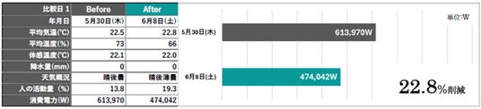 大手老舗百貨店と協議の上、Before Afterの比較において、外気エンタルピー(※1)を基準に、以下の条件が近しい日を比較し削減効果を算出しております。