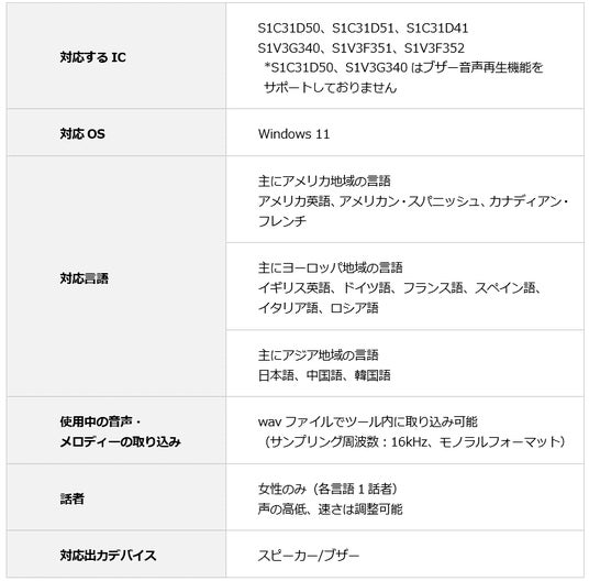 セイコーエプソン株式会社(以下 エプソン)は、エプソン製の音声再生マイコンおよび音声再生専用IC向けに提供している音声データ作成PCツールに、新たに『ブザー用音声データ作成機能』を追加し、このほど提供を開始しました。