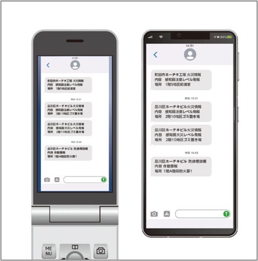 - 火災の発生をSMS(ショートメッセージサービス)やEメールで速やかに通知し、火災情報の迅速な伝達、早期の避難誘導を実現します。