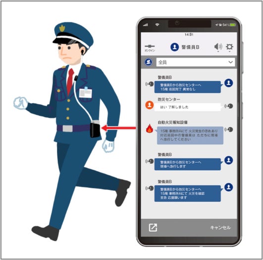 現場警備員が平常時に使用するトランシーバーアプリに火災情報を文字と音声で通知します。AIによる通話の文字起こし、振り返り再生が可能なため聞き逃しを防げます。