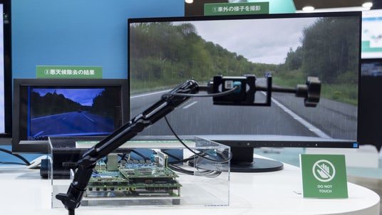 生成AIのコア技術である「Transformerモデル」を軽量・高速化することで、クルマに搭載する小型コンピューター(ECU)にAIの組み込み実装を実現する技術です。本技術は、さまざまなECUへの適用が可能ですが、「EdgeTech+ 2024」では、車載カメラ用ECUに悪天候除去AIを組み込む事例をご紹介しました。