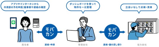 管理会社はモバカンの管理画面をパソコンからアクセスし、各サービスを利用可能です。管理組合や居住者はインターホンやLINE(※)ミニアプリを通して管理会社からのお知らせや申請等、モバカンの機能をご利用いただけます。