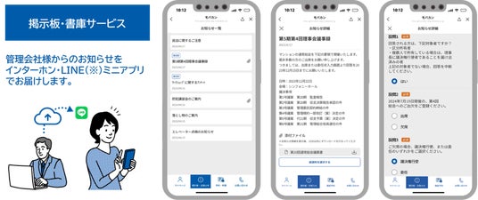 同サービスは、マンションに貼り出される掲示物や、区分所有者や居住者へ送付する書面等といった各種情報を電子化し、各住戸のインターホンやLINE(※)ミニアプリに配信することを可能とします。