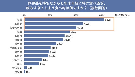 「正月の体重増加を懸念しながらもつい食べてしまった経験はありますか?」という質問には、「かなりある」「少しある」と回答した人が合わせて93.6%となり、そのうち「罪悪感を持ちながらも年末年始に特に食べ過ぎ・飲みすぎてしまう食べ物は何ですか?」と聞いたところ、「お餅」が61.8%で最多という結果に。続いて「お菓子」(45.5%)、「おせち料理」(40.3%)という結果となりました。正月太りを気にしていてもやはり正月はお餅を食べたくなるようです。