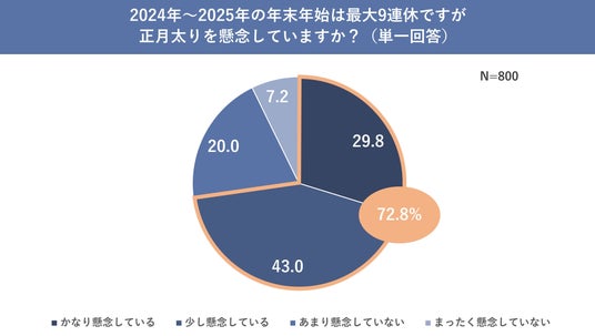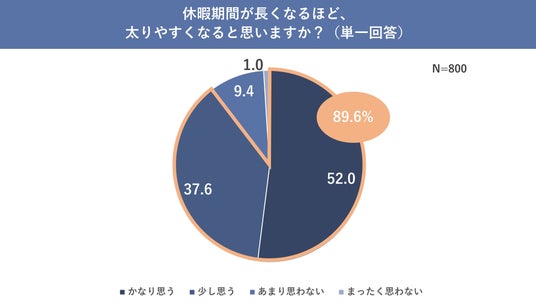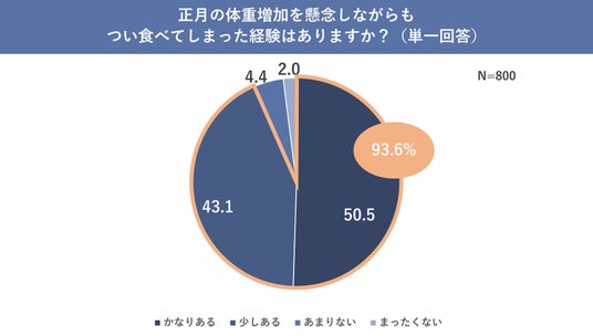 また「休暇期間が長くなるほど、太りやすくなると思いますか?」と聞いたところ、「かなり思う」「少し思う」と回答した人が合わせて89.6%という結果となりました。さらに(2024年12月時点の調査で)「2024年~2025年の年末年始は最大9連休ですが正月太りを懸念していますか?」と聞いたところ、「かなり懸念している」「少し懸念している」と回答した人は72.8%という結果となり、例年以上に正月太りを意識していた人が多いことが明らかとなりました。