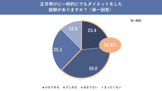 一方で「正月明けに一時的にでもダイエットをした経験がありますか?」という質問には、62.4%の人が「かなりある」「少しある」と回答。半数以上の人が正月太りを解消すべくダイエットに励んだ経験があることが分かります。