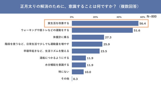 「正月太りの解消のために、意識することは何ですか?」と聞いたところ、最も多かったのは「食生活改善」で56.4%の結果となりました。そのうち「どのように食生活を改善しますか?」という質問に対し、「カロリーの少ないものを食べる」と回答した人が56.3%、続いて「お菓子などの間食を控える」と回答した人が43.9%、「食物繊維が多く含まれているものを食べる」と回答した人が31.5%となり、食事はしっかり摂りながらも、ヘルシーで食物繊維が豊富なものを食べながら正月太りを解消したいという意識がうかがえます。