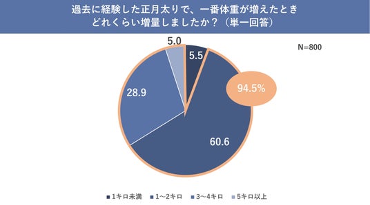 正月太りをした経験がある人を対象に「過去に経験した正月太りで、一番体重が増えたときどれくらい増量しましたか?」という質問をしたところ、3キロ以上と回答した人が33.9%という結果となりました。さらに、正月だけで1キロ以上太ったという人を合わせると94.5%となり、正月太り経験者のほとんどが1キロ以上増えてしまっていることがわかりました。