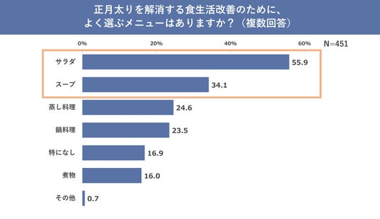 そして「正月太りを解消する食生活改善のために、よく選ぶメニューは何ですか?」と聞いたところ、1位が「サラダ」で55.9%と半数以上の人が選ぶという結果に。次いで2位が「スープ」で34.1%という結果となりました。