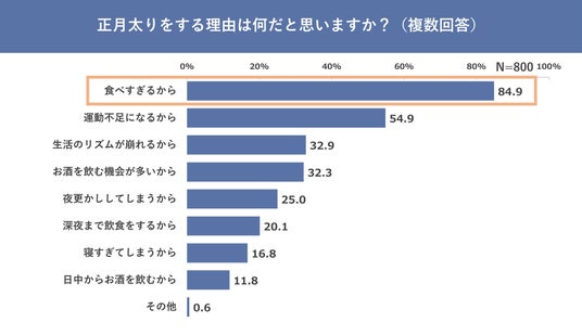 次に「正月太りをする理由は何だと思いますか?」と聞いたところ、84.9%の人が「食べ過ぎるから」と回答。多くの人が、食べ過ぎによる正月太りを経験していることがわかります。