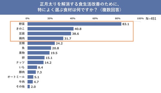 また「正月太りを解消する食生活改善のために、特によく選ぶ食材は何ですか?」と聞いたところ、「野菜」と答えた人が83.1%と最も多く、続いて「きのこ」(40.8%)、「豆腐」(38.6%)、「鶏肉」(31.7%)という結果となりました。