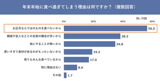 「正月の体重増加を懸念しながらもつい食べてしまった経験はありますか?」という質問で「かなりある」「少しある」と回答した方を対象に、「年末年始に食べ過ぎてしまう理由は何ですか?」と聞いたところ「お正月ならではのものを食べたいから」と回答した人が56.5%と1番多い結果に。1年に1度だからこそ、お正月にしか食べられない食事を楽しみたい気持ちがあるのかもしれません。