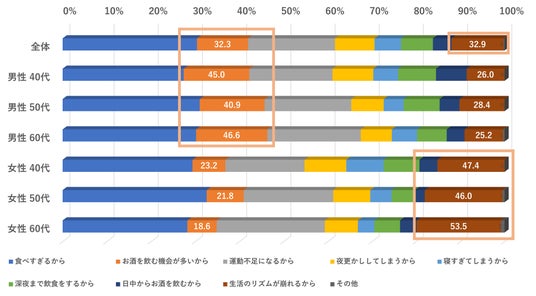 また、年代別に見ると、男性40代から60代の世代では、「お酒を飲む機会が多いから」が全体の32.3%よりも高い割合で正月太りの理由としてあげられています。女性の40代から60代については「生活のリズムが崩れるから」が全体の32.9%よりも高い傾向にあり、男女世代別によって正月太りの原因が異なることがわかります。