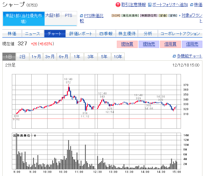 毎日新聞が報じているところによれば、シャープの10-12月期の営業利益が、当初の赤字から一転して黒字になったとのこと。 これを受けてシャープは買い気配でスタートし、320円周辺でもみ合い。 なおこの毎日新聞の報道に関して、シャープは8:55に、報道内容は事実でないとするIRを出している。 飛ばしなのか?それともスクープなのか? 個人的には黒字転換したのだと思っているが。 ドコモのスマホ見ても、それ... ...続きを読む