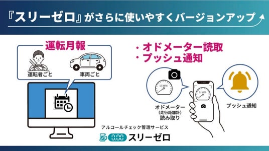 今回、アルコール検知器対応数No.1(※4)の『スリーゼロ』の運転日誌機能に、多くのお客様よりご要望があった月報作成機能を追加し、簡単に月報を作成することが可能となりました。また、運転日誌の記録に不可欠な走行距離の記録を、OCR読み取り機能の活用で実現。スマホのカメラでオドメーターの数値を読み取ることで、運転日誌に自動入力できるようになりました。さらに、運転者用アプリがスマホのプッシュ通知にも対応。運転者へメッセージ通知が可能になりました。