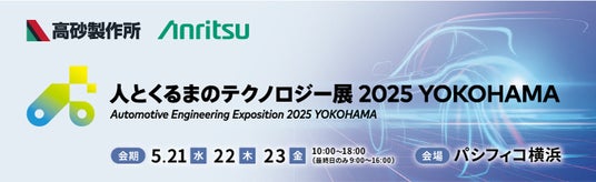 アンリツ株式会社(社長 濱田 宏一)は、2025年5月21日から5月23日までパシフィコ横浜にて開催される『人とくるまのテクノロジー展 2025 YOKOHAMA』において、グループ会社である株式会社高砂製作所のブースに自動車開発を支援する2つの試験ソリューションを出展いたします。