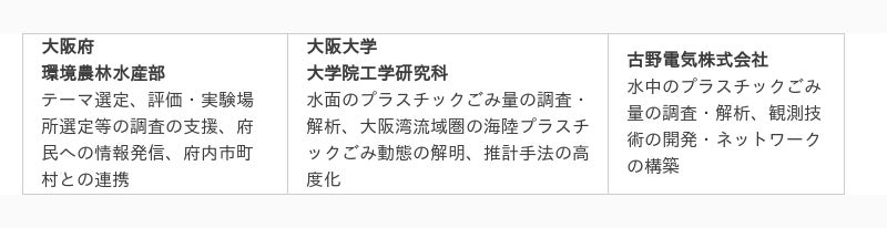 大阪府では、G20大阪サミットにて共有された「大阪ブルー・オーシャン・ビジョン」で示されている「2050年までに海洋プラスチックごみによる新たな汚染ゼロをめざす」社会の実現をめざし、「おおさか海ごみゼロプラン(大阪府海岸漂着物等対策推進地域計画)」を推進しています。大阪湾に流入するプラスチックごみについては、これまでも大阪大学大学院工学研究科と連携し、河川に設置された防災カメラ画像を対象にしたAI解析技術の開発・活用などにより、実態把握に向けて取組がなされてきましたが、水中のごみ量の把握に課題がありました。一方、当社は魚群探知機など高精度な超音波技術を有しており、三者が協力し新たな技術開発などを通じて社会課題解決に繋げるべく、今回の事業連携協定締結に至りました。