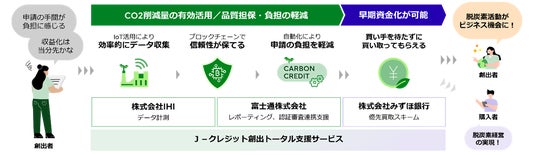 「J-クレジット創出トータル支援サービス」では、IHIのJ-クレジット創出知見および、エンジニアリング知見による環境設備からのデータ取得ノウハウと、富士通のブロックチェーン技術や自動化技術により、高信頼なデータ管理・蓄積を実現するとともに、J-クレジットの創出に必要な申請手続きを効率化し、負担を軽減します。さらに、みずほ銀行のお客さまネットワークおよび、流通市場におけるプレゼンスを背景としたJ-クレジットの優先買取りスキームもワンストップで提供します。