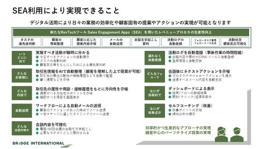 「AI技術の進化により、営業活動の価値とアプローチが根本的に変わろうとしています。この変革期において、インサイドセールスの第一人者であるブリッジインターナショナル様との協業は、大きな意義があります。当社のAI技術と、ブリッジインターナショナル様の実践的な営業ノウハウを組み合わせることで、日本企業の営業生産性を世界最高水準に引き上げることを目指してまいります」。