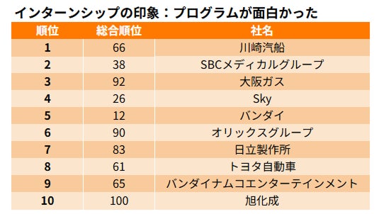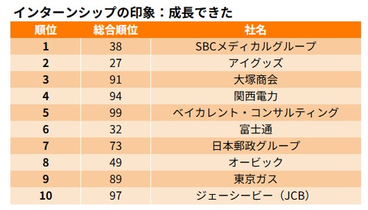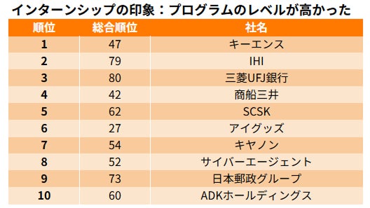 また、「インターンシップの印象」が高評価だった企業は、総合ランキングでも目立った動きを見せています。